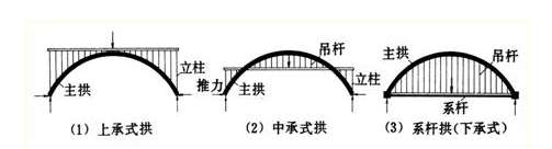 6、按桥面位置分:上承式拱桥,中承式拱桥,下承式拱桥。如图5-4 所示:
