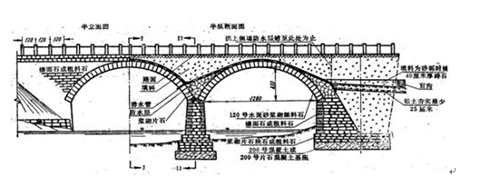 拱桥中多采用实腹式。实腹式拱上建筑由侧墙、拱腹填料、护拱以及变形缝、防水层、泄水管和桥面等部分组成。(如图12-11所示)