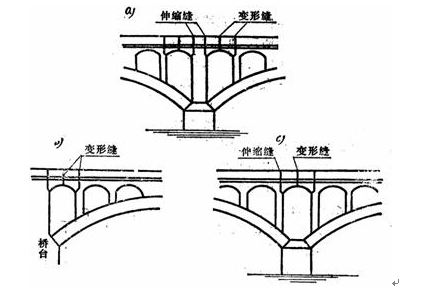 2、伸缩缝与变形缝,保证结构的安全性与耐久性,相对变形较大的位置设伸缩缝、相对变形较小处设变形缝;使拱上建筑适应主拱圈的变形;