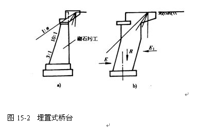 桥台台身埋置于台前溜坡内,不需另设翼墙,仅由台帽两端的耳墙与路提衔接。图15-2a为直立式埋置桥台;15-2b为后倾式,它使台身重心向后,用以平衡台后填土的倾覆力矩,但倾斜度应适当。