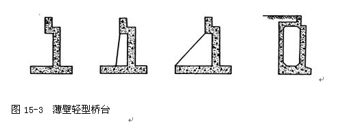 薄壁轻型桥台常用的型式有悬臂式、扶壁式、撑墙式及箱式等,如图所示。在一般情况下,悬臂式桥台的混凝土数量和用钢量较高、撑墙式与箱式的模板用量较高。薄壁桥台的优点与薄壁墩类同,可依据桥台高度,地基强度和土质等因素选定。