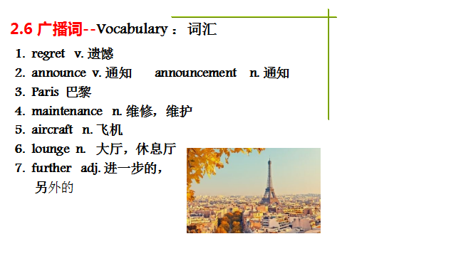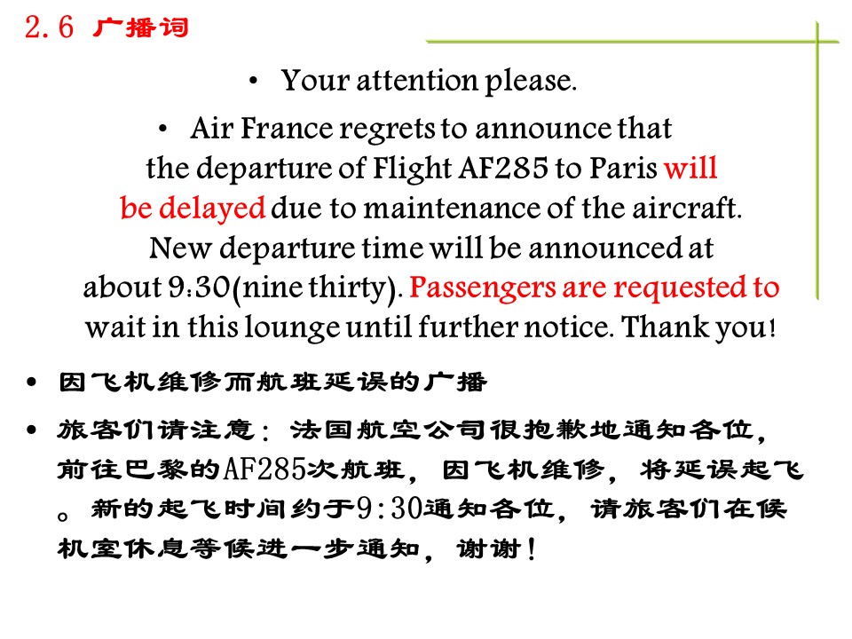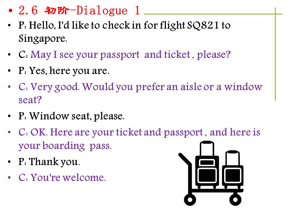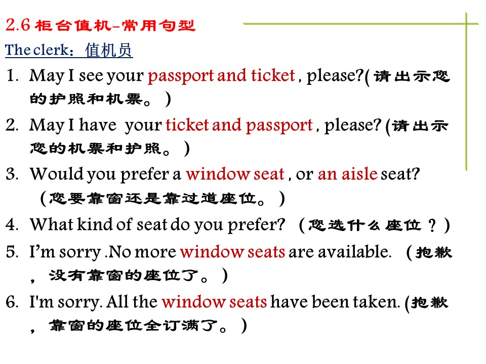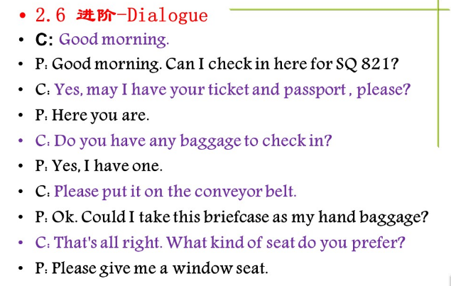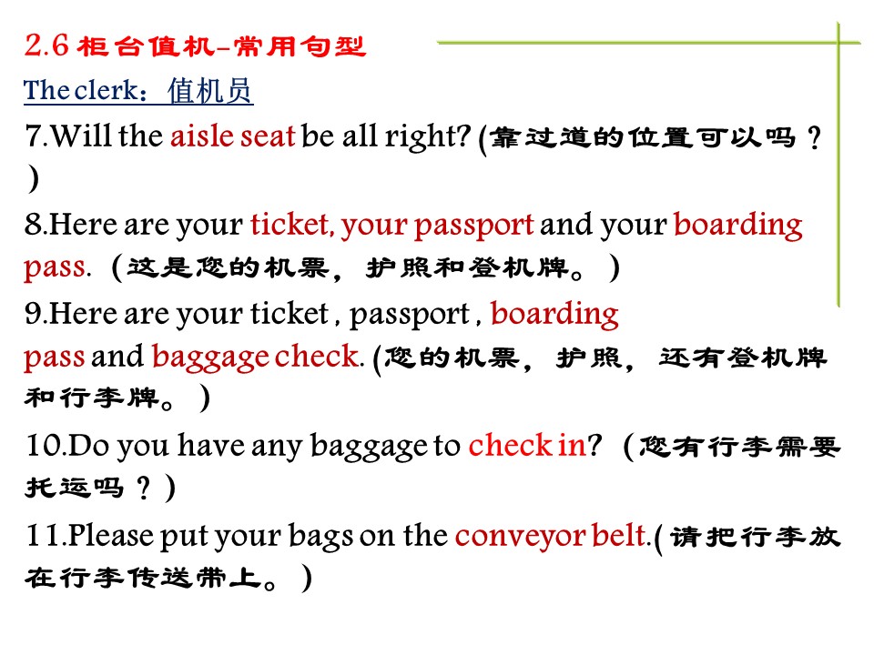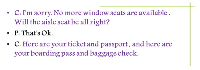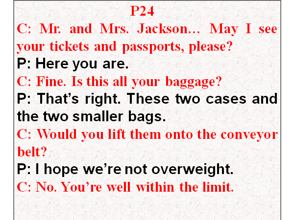The first place passengers go to is the check-in desk where they check their baggage and are given their seats. After the passengers arrive at the check-in desk, where a member of the ground staff will be waiting for them, they give their passports and air ticket to the check-in staff to check. Then the baggage is weighed . If the baggage is over 20 kilo.(economy class allowance 免费限额), the staff will ask the passengers either to remove some items form the baggage or to pay an excess baggage fee. Baggage allowance( may vary from airline to airline. Passenger are also allowed to carry small bags onto the aircraft. This is known as hand baggage or carry-on items, such as umbrellas, digital products and computers. The weight of the hand baggage is limited within 8 kilos and must be of a certain size. Then the tickets and passports, as well as boarding cards, will be returned to the passengers. The boarding cards have the seat number, the passenger's name, flight number, departure time and destination .