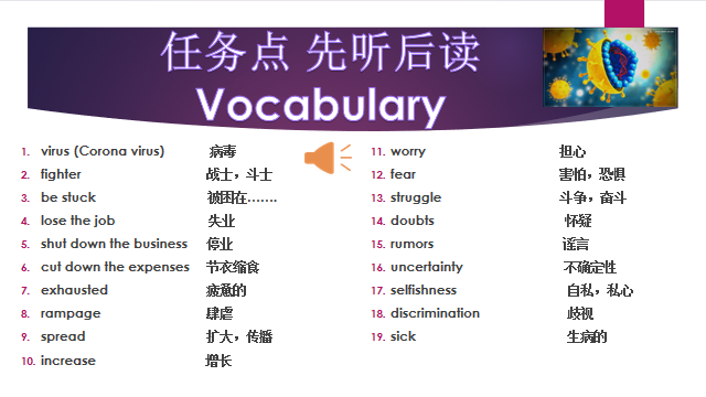 核心词汇:任务1: 听录音跟读,反复操练,记住其中文意思。然后打开FIF口语训练平台,完成作业。任务2: 听录音,写下所缺的词,拍下,上传。