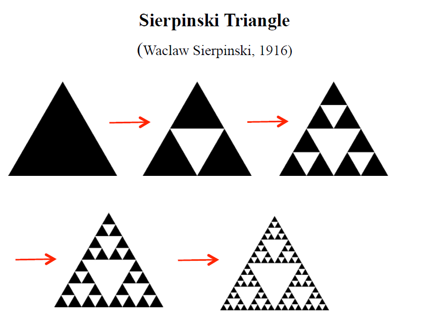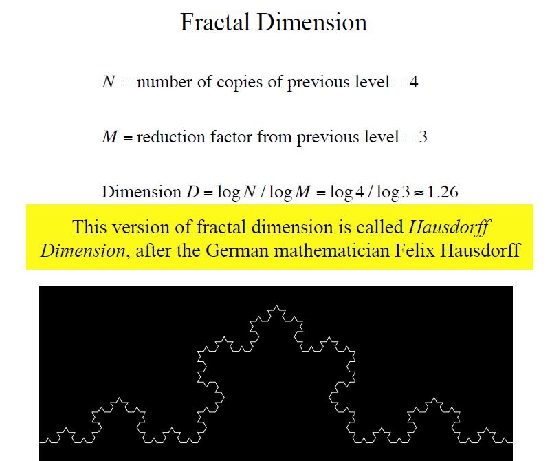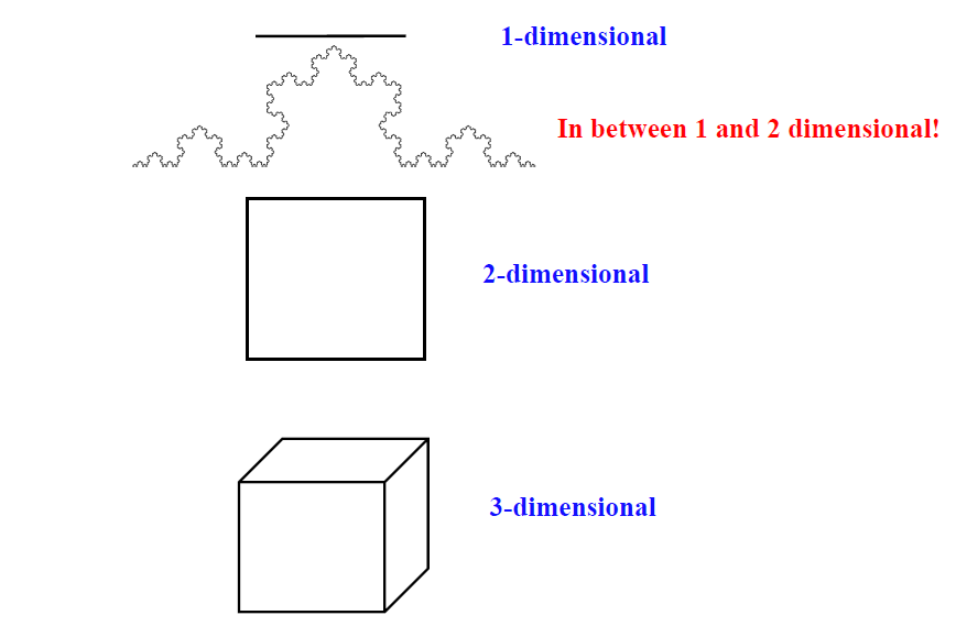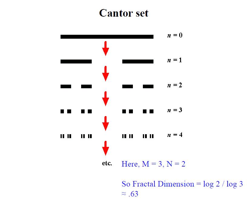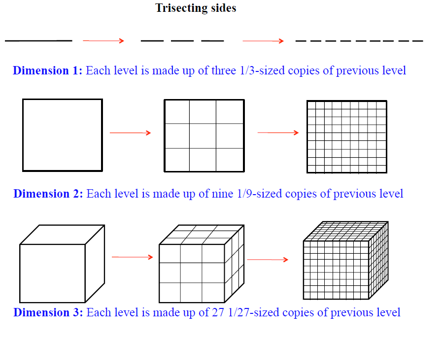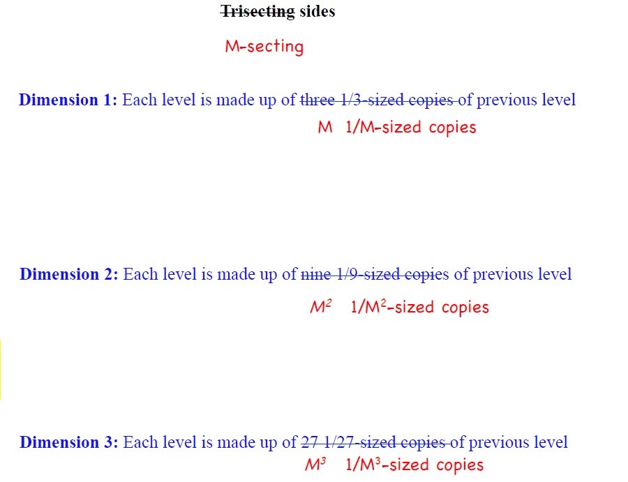 ● Create a geometric structure from a given D-dimensional object (e.g., line, square, cube, etc) by repeatedly dividing the length of its sides by a number M.