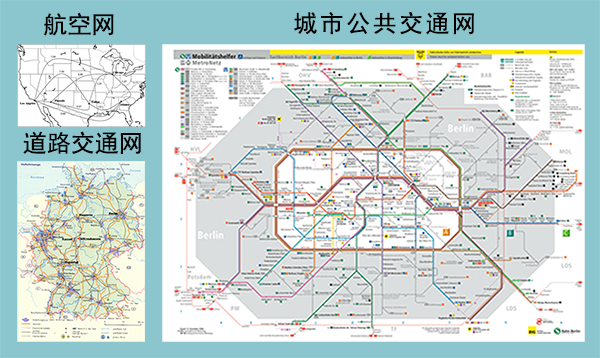 交通运输网:航线网,铁路网,公路网,自然河流网。