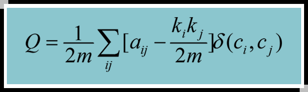 其含义是:网络中连接社团内部顶点间的边的比例与拥有相同社团结构但是顶点间随机连接的网络中连接社团内部顶点间的边的比例的期望值的差值。