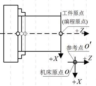 在数控车床上,机床原点一般取在卡盘端面与主轴中心线的交点处。同时,通过设置参数的方法,也可将机床原点设定在X、Z坐标的正方向极限位置上。