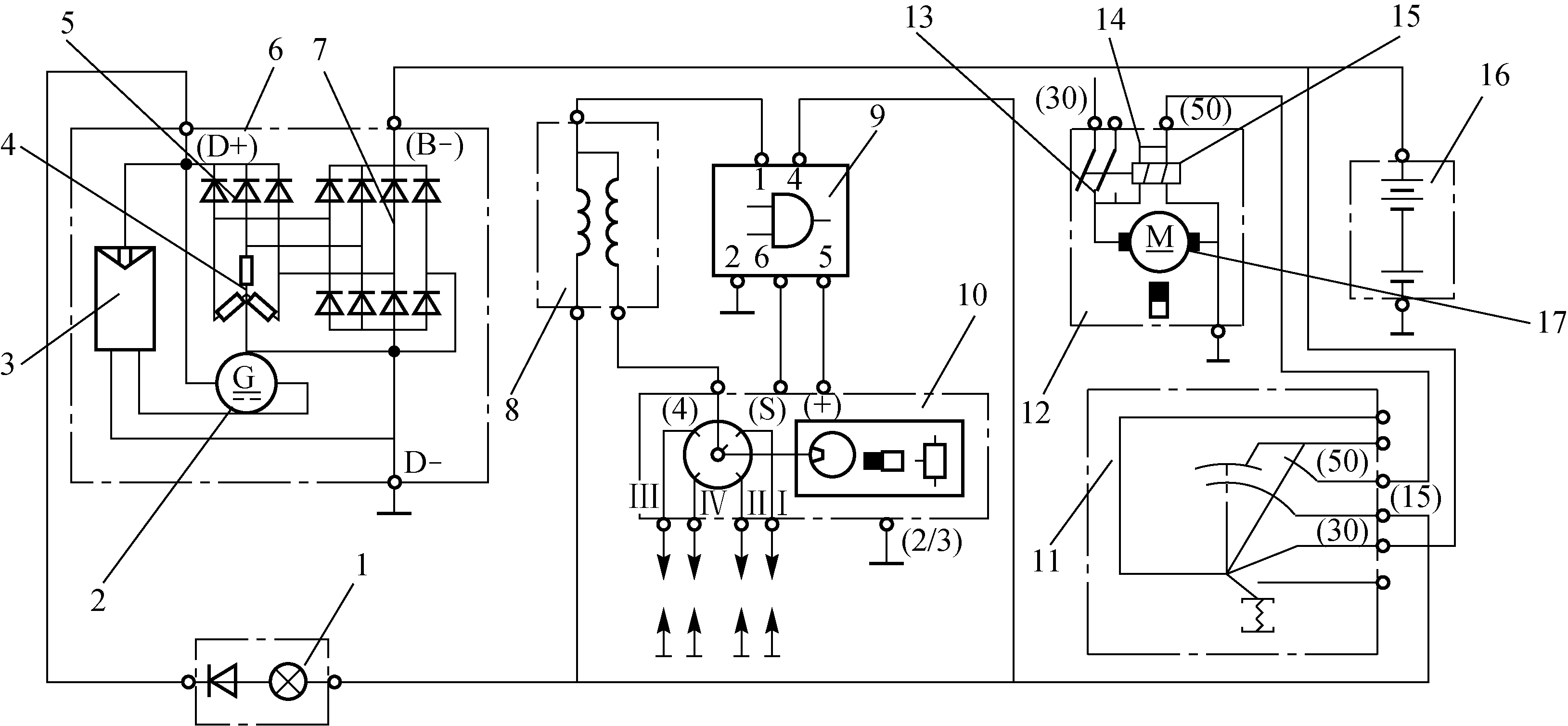 图2-9 捷达轿车充电、起动、点火系统工作电路图