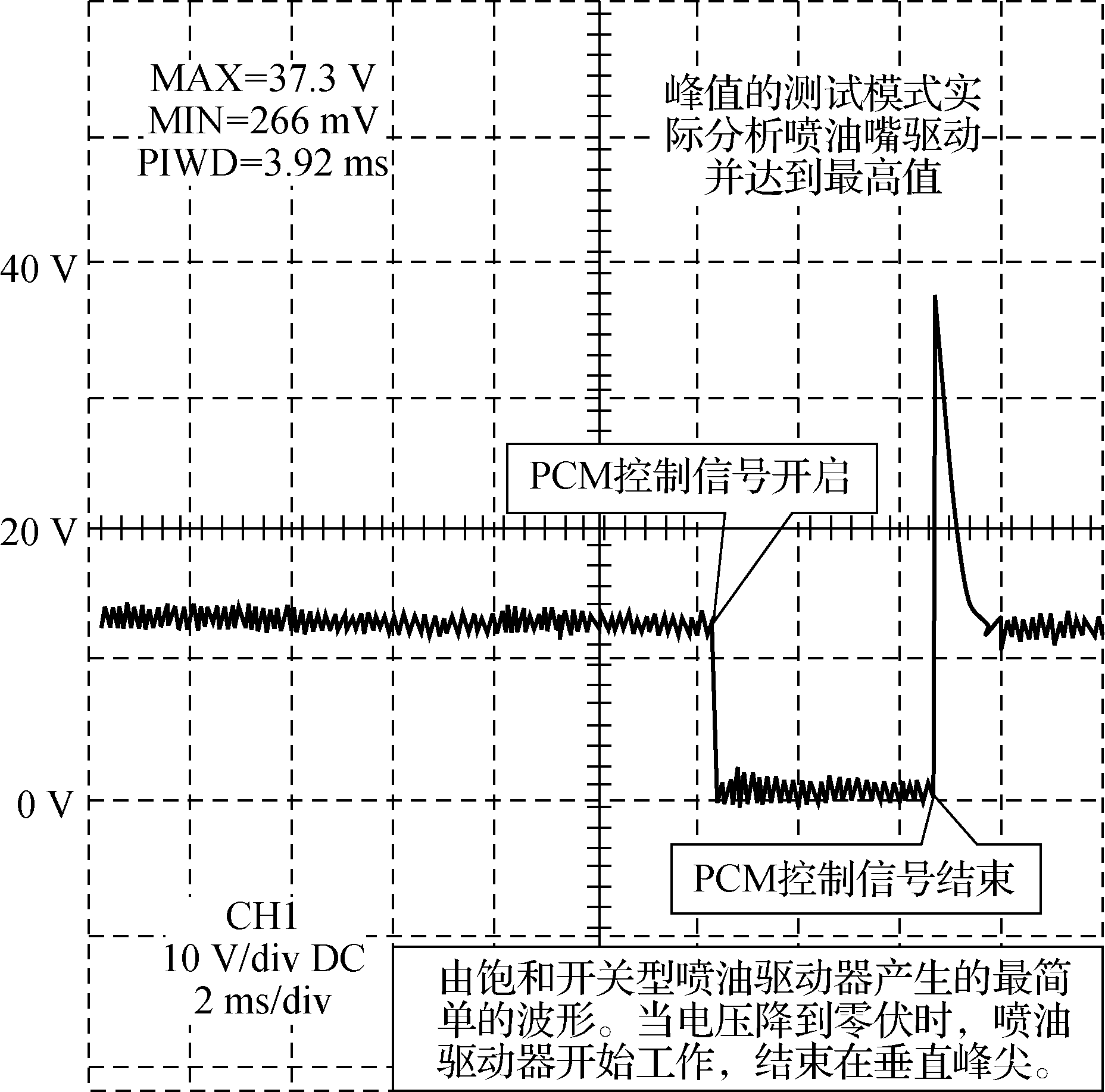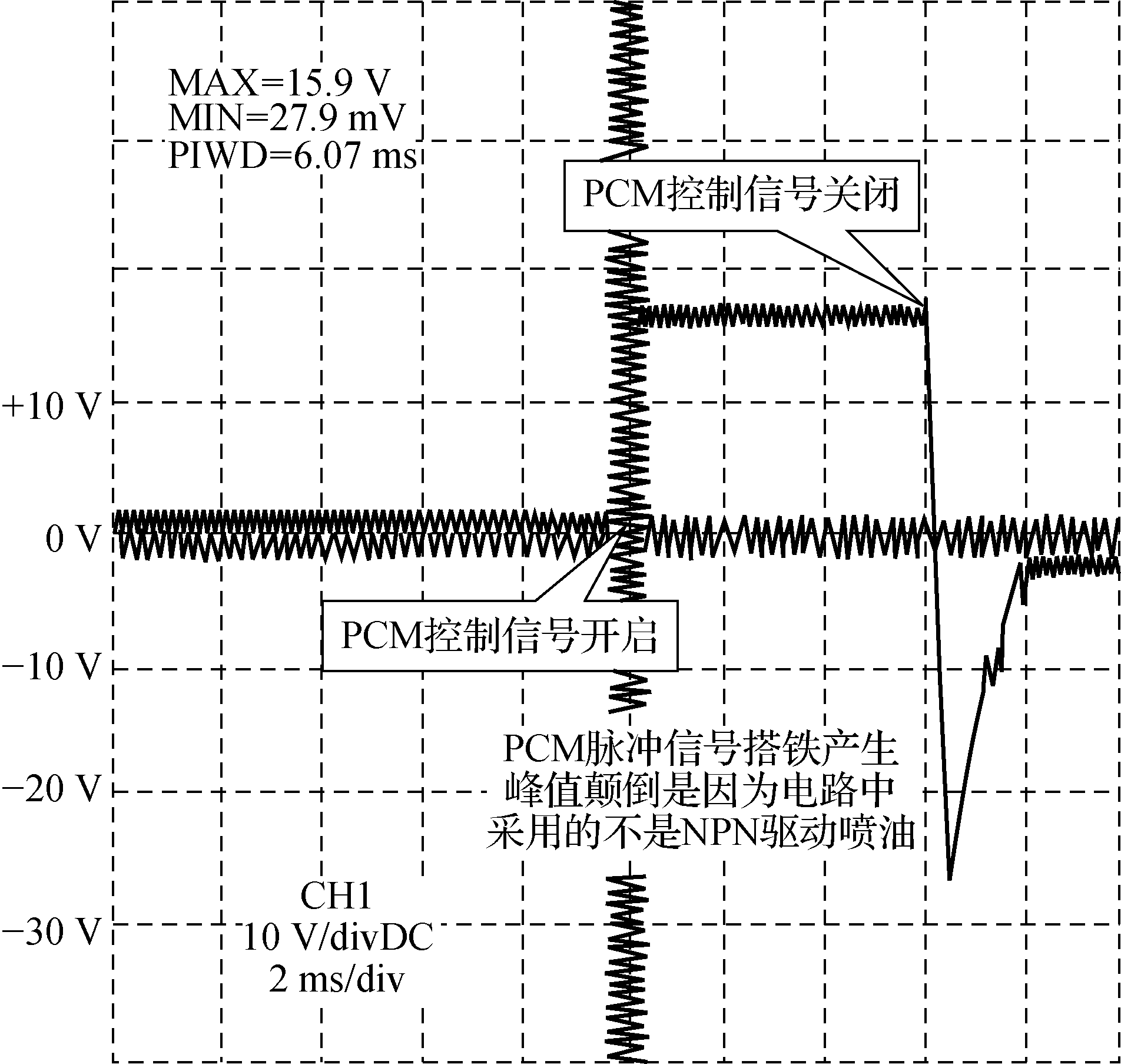 PNP型喷油器的脉冲控制电源连接到喷油器上,在发动机正常工作的时候,其波形如图3-2所示。