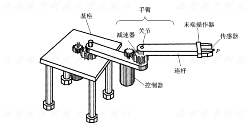 3)手臂是支承手腕和末端执行器的部件。它由动力关节和连杆组成,用来改变末端执行器的空间位置。