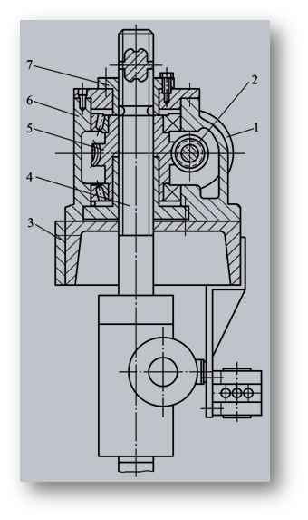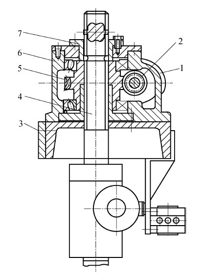 1—电动机;2—蜗杆;3—臂架;4—丝杠;5—蜗轮;6—箱体;7—花键套