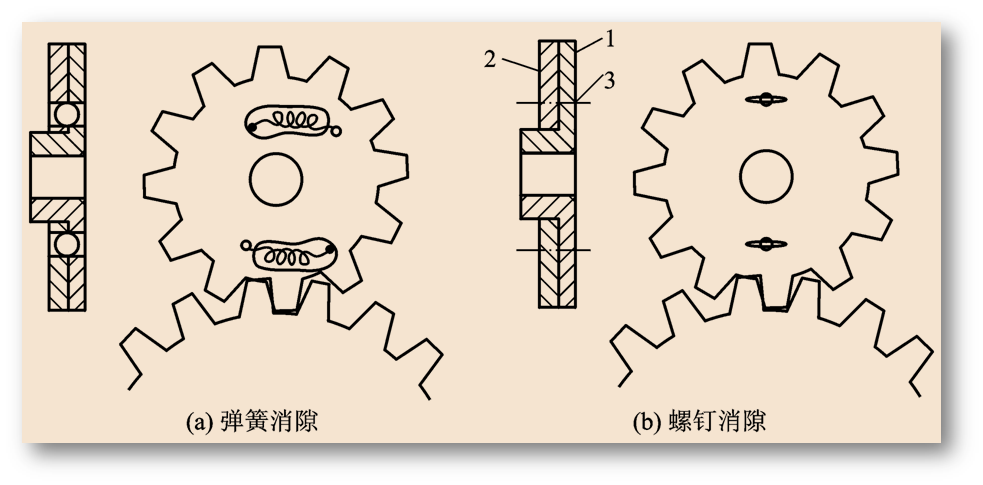 图2.18(a)所示的弹簧消隙方法中的齿轮是由具有相同齿轮参数的并只有一半齿宽的两个薄齿轮组成,利用弹簧的压力使它们与配对的齿轮两侧齿廓相接触,完全消除了齿侧间隙。图2.18(b)所示为用螺钉3将两个薄齿轮1和2连接在一起,代替图2.18(a)中的弹簧,其好处是侧隙可以调整。