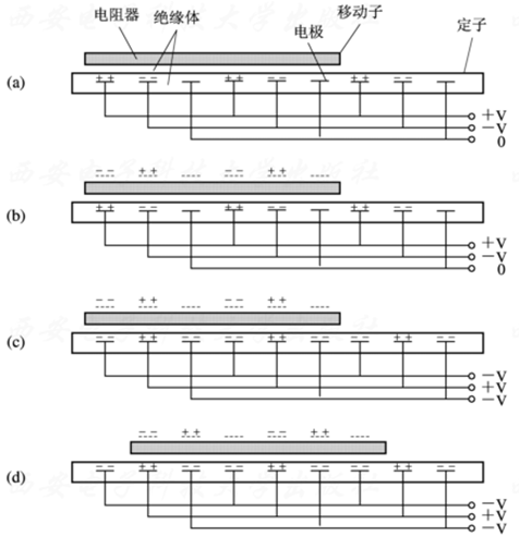 如图2.28是一个带有电阻器移动子的三相静电驱动器的工作原理图。在图2.28(b)中,表示了当把电压施加到定子的电极上时,在移动子中会感应出极性与其相反的电荷来。在图2.28(c)中,当把外加电压变化时,因为移动子上的电荷不能立即变化,所以由于电极的作用,移动子会受到右上方向的合力作用,驱动其向右方移动。