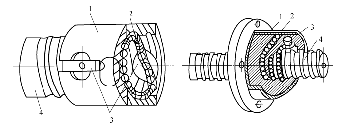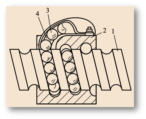 1—螺母;2—滚珠;3—回程引导装置;4—丝杠;