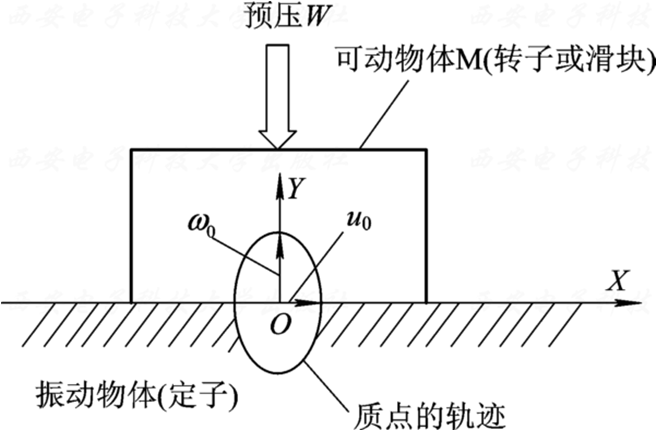 超声波电机的工作原理是用超声波激励弹性体定子, 使其表面形成椭圆运动,由于其上与转子(或滑块)接触,在摩擦的作用下转子获得推力输出。 如图2.29所示, 可以认为定子按照角频率ω0,进行超声波振动, 在预压W作用下, 转子被推动。