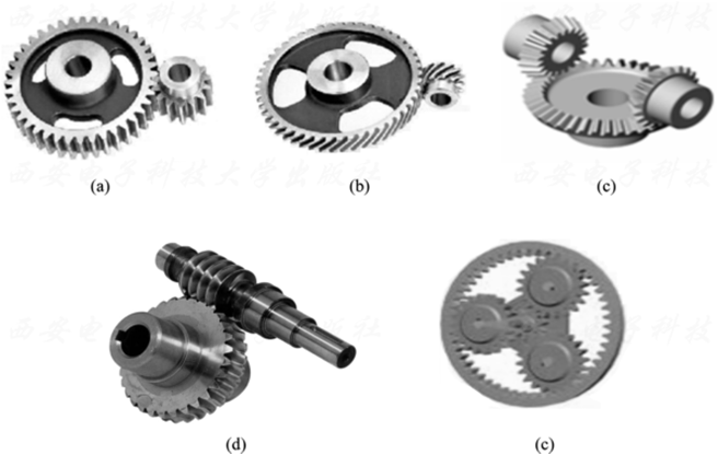 (a) 圆柱齿轮;(b) 斜齿轮;(c) 锥齿轮;(d) 蜗轮蜗杆; (e) 行星轮系;