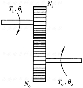 齿轮链是由两个或两个以上的齿轮组成的传动机构。它不但可以传递运动角位移和角速度,而且可以传递力和力矩。 现以具有两个齿轮的齿轮链为例, 说明其传动转换关系。其中一个齿轮装在输入轴上,另一个齿轮装在输出轴上, 如图2.12所示。