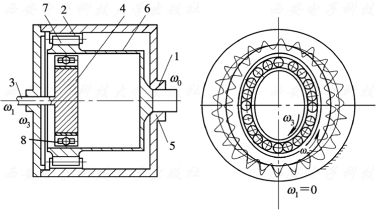 5—输出轴;6—柔轮;7—柔轮的齿;8—滚珠轴承