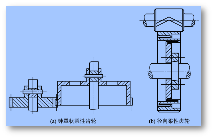 图2.19(a) 所示为一种钟罩形状的具有弹性的柔性齿轮,在装配时对它稍许加些预载,就能引起轮壳的变形,从而引起每个轮齿的双侧齿廓都能啮合,消除了侧隙。图2.19(b) 所示为采用了上述同样的原理却用不同设计形式的径向柔性齿轮,轮壳和齿圈是刚性的,但与齿轮圈连接处具有弹性。