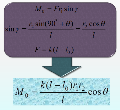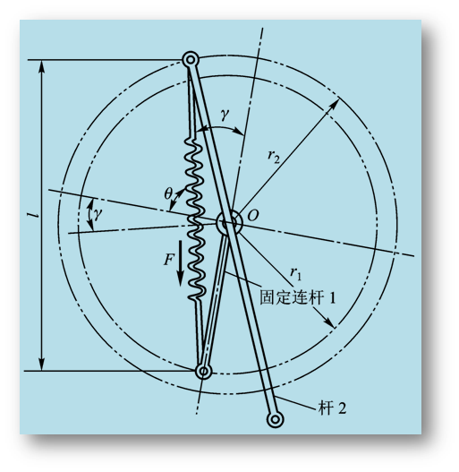 如图2.37所示,设杆2代表要平衡的臂杆,平衡时在杆2的尾端离转动中心r2处安装一根长弹簧。长弹簧的另一端安装在长度为r1的固定连杆1上,固定连杆1的另一端固定在转动中心O上。如果杆2的原始位置和固定连杆1垂直,工作时杆2顺时针转动了角度θ,则在工作位置上弹簧力F 产生的平衡力矩M0为