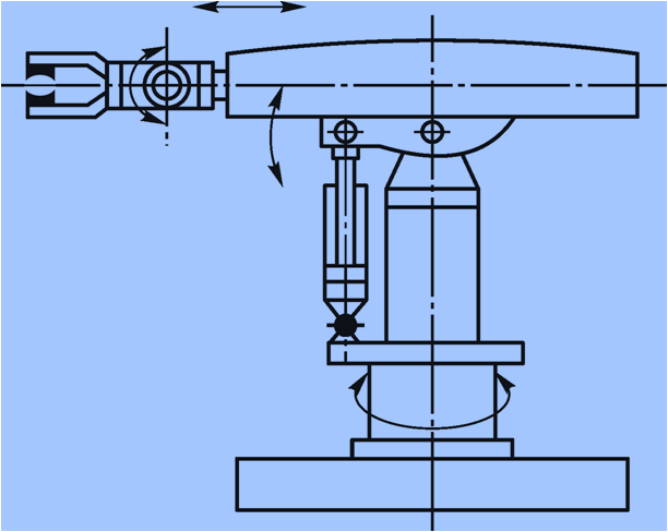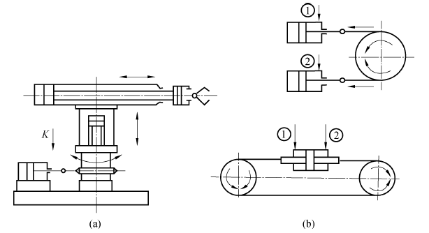 手臂回转与升降机构常采用回转缸与升降缸单独驱动,适用于升降行程短而回转角度小于360°的情况,也有采用升降缸与气马达-锥齿轮传动的结构。