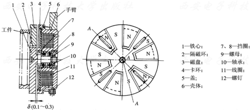 下图所示为盘状磁吸附取料手的结构图。铁心1和磁盘3之间用黄铜焊料焊接并构成隔磁环2,既焊为一体又将铁心和磁盘分隔,这样使铁心1成为内磁极,磁盘3成为外磁极其磁路由壳体6的外圈,经磁盘3、工件和铁心,再到壳体内圈形成闭合回路, 以此吸附工件。铁心、磁盘和壳体均采用8~10号低碳钢制成, 可减少剩磁,并在断电时,不吸或少吸铁屑。盖5为用黄铜或铝板制成的隔磁材料,用以压住线圈11,防止工作过程中线圈的活动。挡圈7、8用以调整铁心和壳体的轴向间隙,即磁路气隙δ,在保证铁心正常转动的情况下,气隙越小越好,气隙越大,则电磁吸力会显著地减小,因此,一般取δ=0.1~0.3 mm。在机器人手臂的孔内可做轴向微量地移动,但不能转动。铁心1和磁盘3一起装在轴承上,用以实现在不停车的情况下自动上下料。