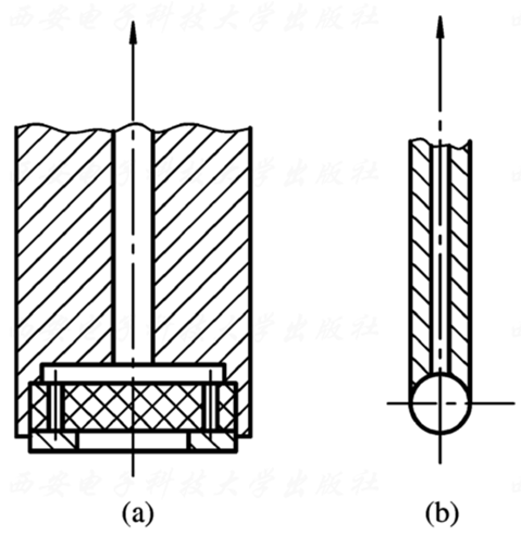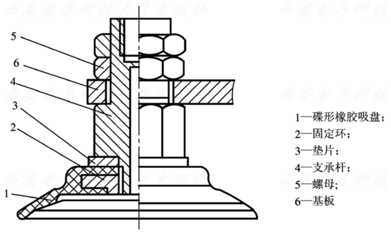 图2.59所示为真空吸附取料手的结构原理。其真空的产生是利用真空泵, 真空度较高。主要零件为碟形橡胶吸盘1, 通过固定环2安装在支承杆4上, 支承杆由螺母5固定在基板6上。取料时, 碟形橡胶吸盘与物体表面接触, 橡胶吸盘在边缘既起到密封作用,又起到缓冲作用, 然后真空抽气,吸盘内腔形成真空, 吸取物料。放料时, 管路接通大气, 失去真空, 物体放下。为避免在取、放料时产生撞击, 有的还在支承杆上配有弹簧缓冲。为了更好地适应物体吸附面的倾斜状况,有的在橡胶吸盘背面设计有球铰链。真空吸附取料手有时还用于微小无法抓取的零件, 如图2.60所示。