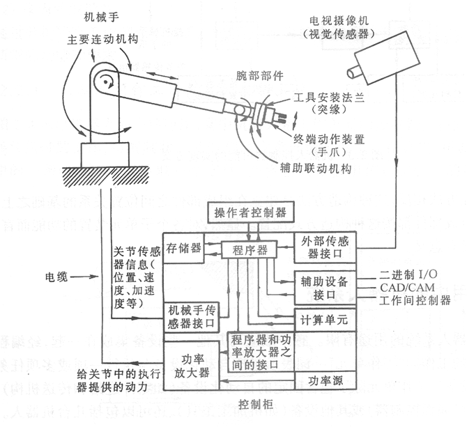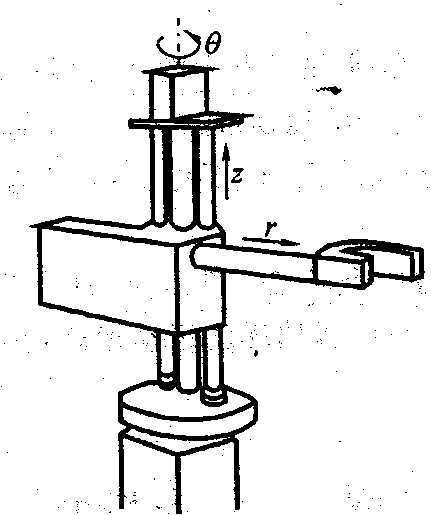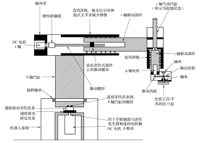 圆柱坐标式机器人主体结构具有三个自由度:腰转、升降和伸缩。亦即具有一个旋转运动和两个直线运动。