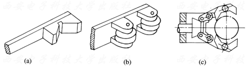 如图2.52所示的平面指为夹钳式手的平面指指端,一般用于夹持方形工件(具有两个平行平面), 板形或细小棒料。另外,尖指和薄、长指一般用于夹持小型或柔性工件。 其中, 薄指一般用于夹持位于狭窄工作场地的细小工件, 以避免和周围障碍物相碰;长指一般用于夹持炽热的工件, 以免热辐射对手部传动机构的影响。