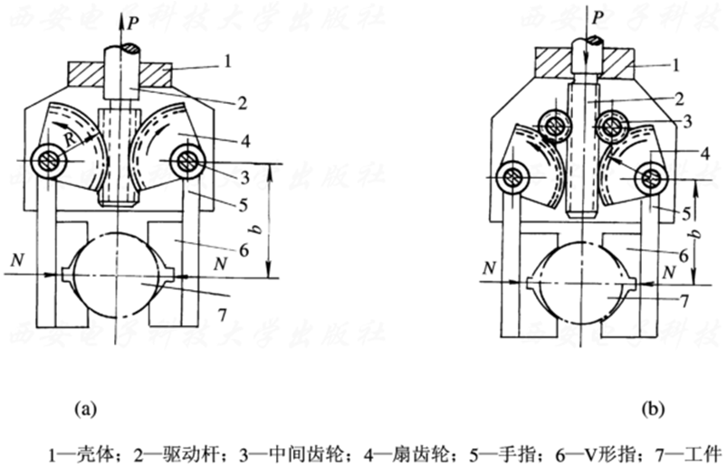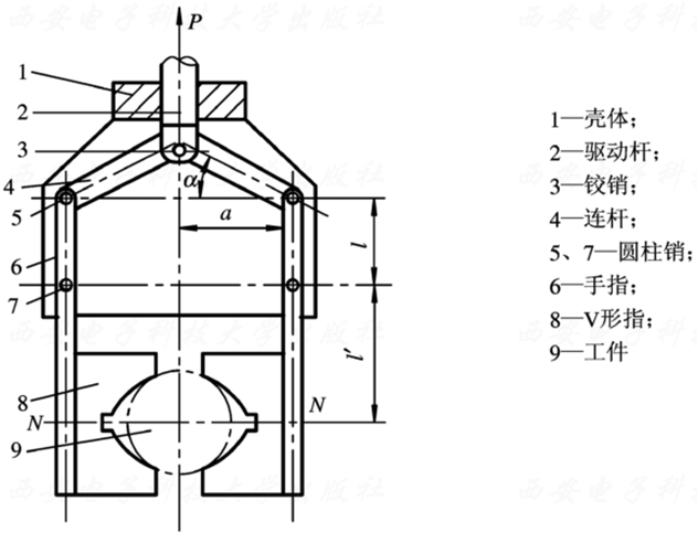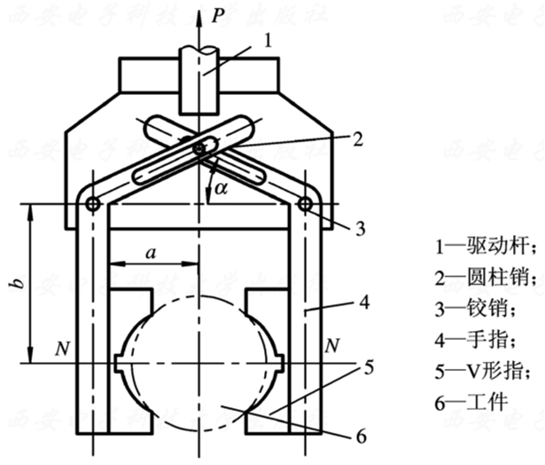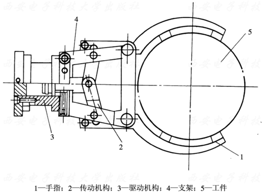 图2.55所示为双支点连杆杠杆式手部简图。驱动杆2末端与连杆4由铰销3铰接, 当驱动杆2作直线往复运动时,则通过连杆推动两杆手指各绕其支点作回转运动,从而使手指松开或闭合。