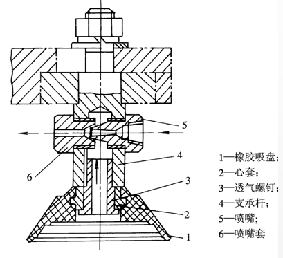 气流负压吸附取料手如图2.61所示。气流负压吸附取料手是利用流体力学的原理, 当需要取物时, 压缩空气高速流经喷嘴5时, 其出口处的气压低于吸盘腔内的气压, 于是腔内的气体被高速气流带走而形成负压, 完成取物动作;当需要释放时, 切断压缩空气即可。这种取料手需要压缩空气,工厂里较易取得,故成本较低。