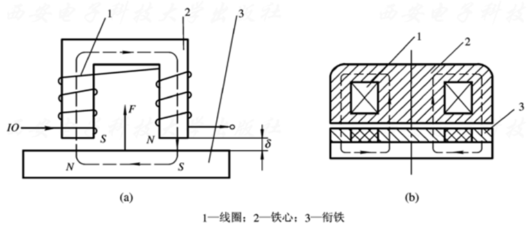 电磁铁工作原理如图2.63所示。当线圈1通电后, 在铁心2内外产生磁场, 磁力线穿过铁心, 空气隙和衔铁3被磁化并形成回路, 衔铁受到电磁吸力F的作用被牢牢吸住。实际使用时, 往往采用如图(b)所示的盘式电磁铁, 衔铁是固定的, 衔铁内用隔磁材料将磁力线切断, 当衔铁接触磁铁物体零件时, 零件被磁化形成磁力线回路,并受到电磁吸力而被吸住。