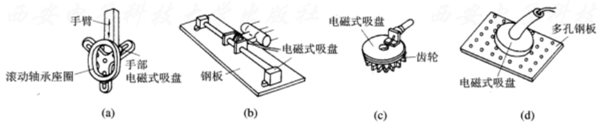 (c) 吸取齿轮用的电磁式吸盘; (d) 吸附多孔钢板用的电磁式吸盘