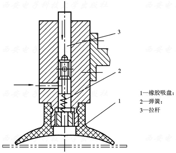 挤压排气式取料手如图2.62所示。其工作原理为: 取料时吸盘压紧物体, 橡胶吸盘变形, 挤出腔内多余的空气,取料手上升, 靠橡胶吸盘的恢复力形成负压, 将物体吸住;释放时,压下拉杆3,使吸盘腔与大气相连通而失去负压。 该取料手结构简单, 但吸附力小, 吸附状态不易长期保持。