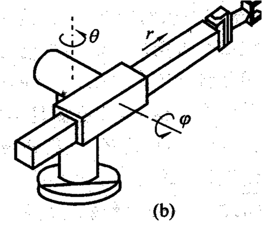 球面坐标式(极坐标):机器人主体结构具有三个自由度,两个旋转运动和一个直线运动。