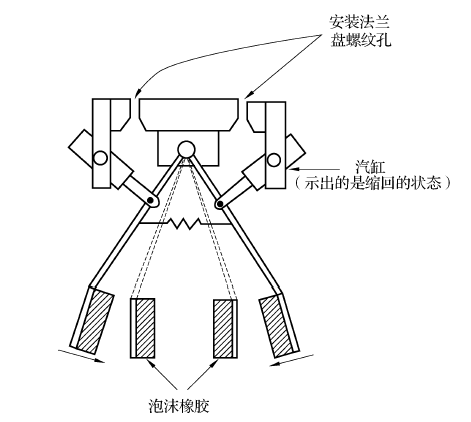 上图(a)所示为单作用斜楔式回转型手部结构简图。斜楔向下运动,克服弹簧拉力,使杠杆手指装着滚子的一端向外撑开,从而夹紧工件; 斜楔向上移动,则在弹簧拉力作下使手指松开。手指与斜楔通过滚子接触可以减少摩擦力, 提高机械效率,有时为了简化,也可让手指与斜楔直接接触。也有如图(b)所示的结构。