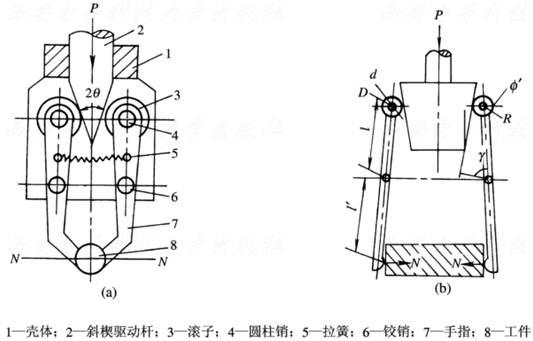 夹钳式手部中较多的是回转型手部, 其手指就是一对杠杆,一般再同斜楔、滑槽、连杆、齿轮、蜗轮蜗杆或螺杆等机构组成复合式杠杆传动机构, 用以改变传动比和运动方向等。图2.53所示为单作用斜楔式手部结构简图。