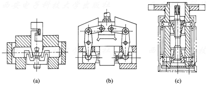 (a)为斜楔平移机构 (b)为连杆杠杆平移结构 (c)为螺旋斜楔平移结构