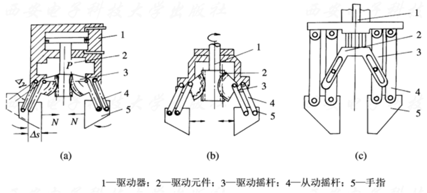 实现直线往复移动的机构很多, 常用的斜楔传动、齿条传动、螺旋传动等均可应用于手部结构,如图2.57所示。它们既可是双指型的,也可是三指(或多指)型的;既可自动定心,也可非自动定心。