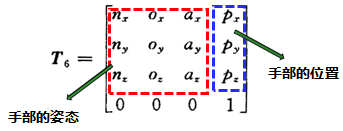 为手部坐标系(手部) 的位姿。由于其可写成(4×4)的矩阵形式,即可得向量p、n、o、a,把