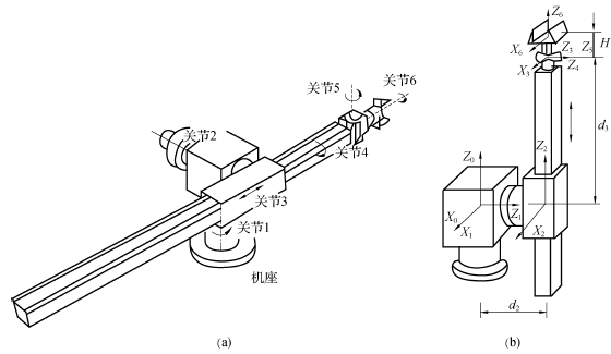 该机器人有6个自由度,除关节3为移动关节外,其余关节均为转动关节。其结构示意图如图3.25所示。其中关节1和关节2的轴线相互垂直,关节2和关节3的轴线相互垂直,关节3和关节4的轴线相互平行,关节4和关节5的轴线相互垂直,关节5和关节6的轴线相互垂直。