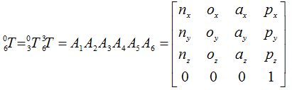 此式右边表示了从固定参考系到手部坐标系的各连杆坐标系之间的变换矩阵的连乘,左边T6表示这些变换矩阵的乘积,也就是手部坐标系相对于固定参考系的位姿。上式计算结果是一个如下的(4×4) 矩阵: