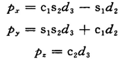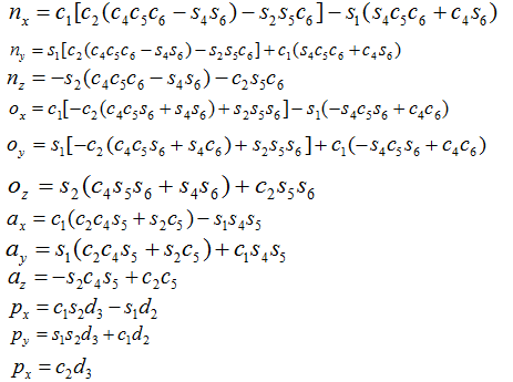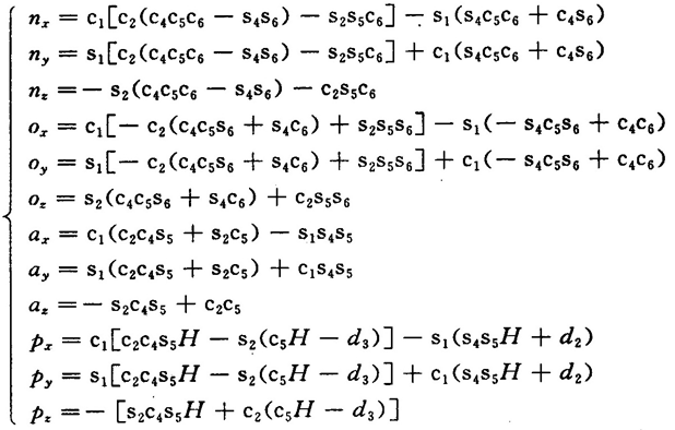 根据上述五个矩阵方程对应元素相等,可得到若干个可解的代数方程,便可求出关节变量或