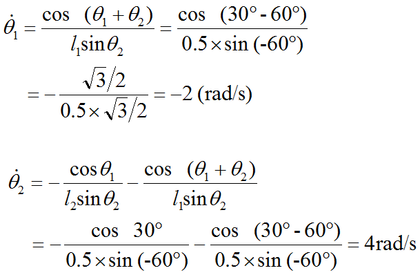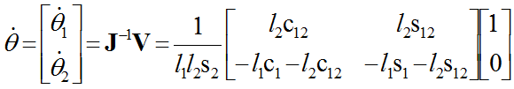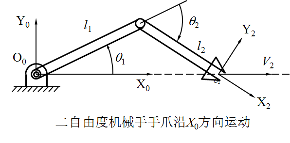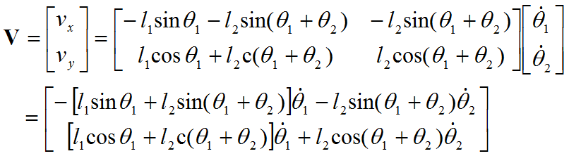 式中右边第一项表示仅由第一个关节运动引起的端点速度;右边第二项表示仅由第二个关节运动引起的端点速度;总的端点速度为这两个速度矢量的合成。