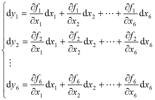 数学上雅可比矩阵(Jacobian matrix)是一个多元函数的偏导矩阵。假设有六个函数,每个函数有六个变量,即:
