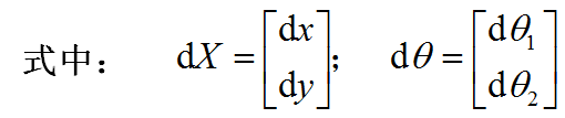 我们将J称为二自由度平面关节型工业机器人的速度雅可比,它反映了关节空间微小运动dθ与手部作业空间微小位移dX之间的关系。