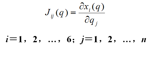 式中J(q)是6×n的偏导数矩阵,称为n自由度工业机器人速度雅可比矩阵。它反映了关节空间微小运动dq与手部作业空间微小运动dX之间的关系。它的第i行第j列元素为: