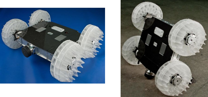 沙蚤机器人(SandFlea)是一种跳跃式机器人,由美国国防高级研究计划局(DARPA)联合波士顿动力公司共同研制,其结构如图4.1所示,图4.1(a)为“沙蚤”机器人行驶状态,图4.1(b)为“沙蚤”机器人起跳的状态。战场上的地形往往复杂多变,面对许多山坡或障碍物,实在不值得美国大兵们赌上命去翻越。在这个时候选择机器人勘察就是一个非常好的办法。沙蚤机器人作为一款遥控侦察机器人就是为此而存在,该机器人呈鞋盒状,重约4.5kg,通常采用4 轮行驶,但也能垂直跳跃,跳跃高度达10m,能独立越过壕沟和障碍。该车装备了操作控制系统和1 部摄像机,能够通过掌上电脑或笔记本电脑进行控制。