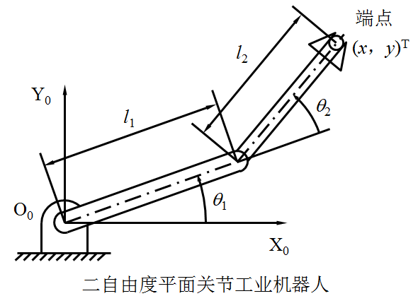 例: 下图所示为二自由度平面关节型工业机器人(2R工业机器人),其端点位置x,y与关节变量θ1、θ2的关系为: