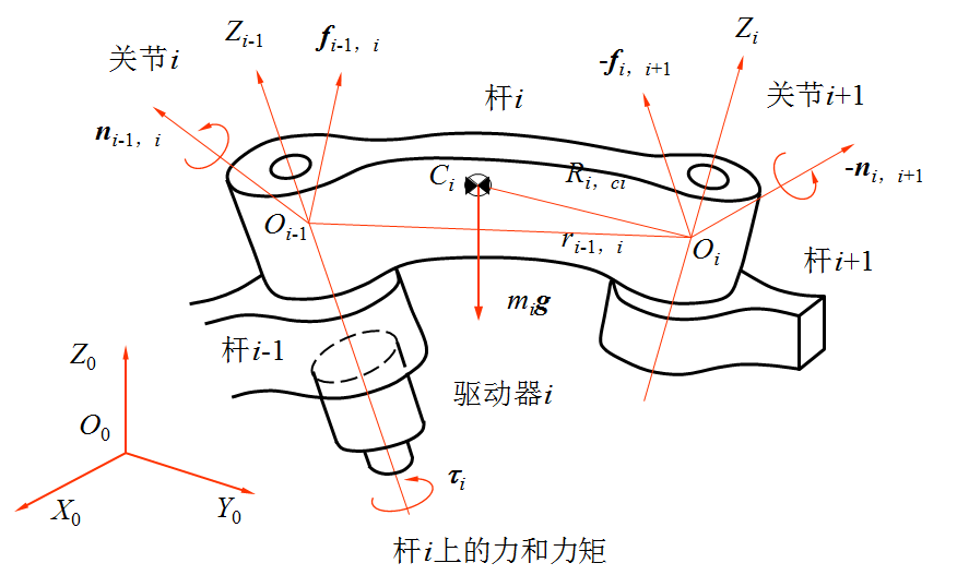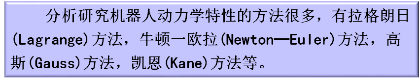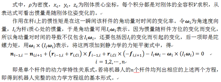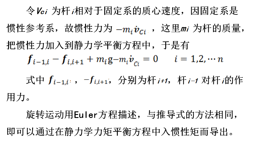 牛顿—欧拉方法直接利用牛顿力学的刚体动力学知识,导出机器人逆动力学的递推公式,即已知机器人各连杆的速度、角速度及转动惯量,就可以利用牛顿—欧拉刚体动力学公式导出机器人各关节执行器的驱动力及驱动力矩的递推公式。然后再由它归纳出机器人动力学的数学模型—机器人机械系统的矩阵形式的运动方程。